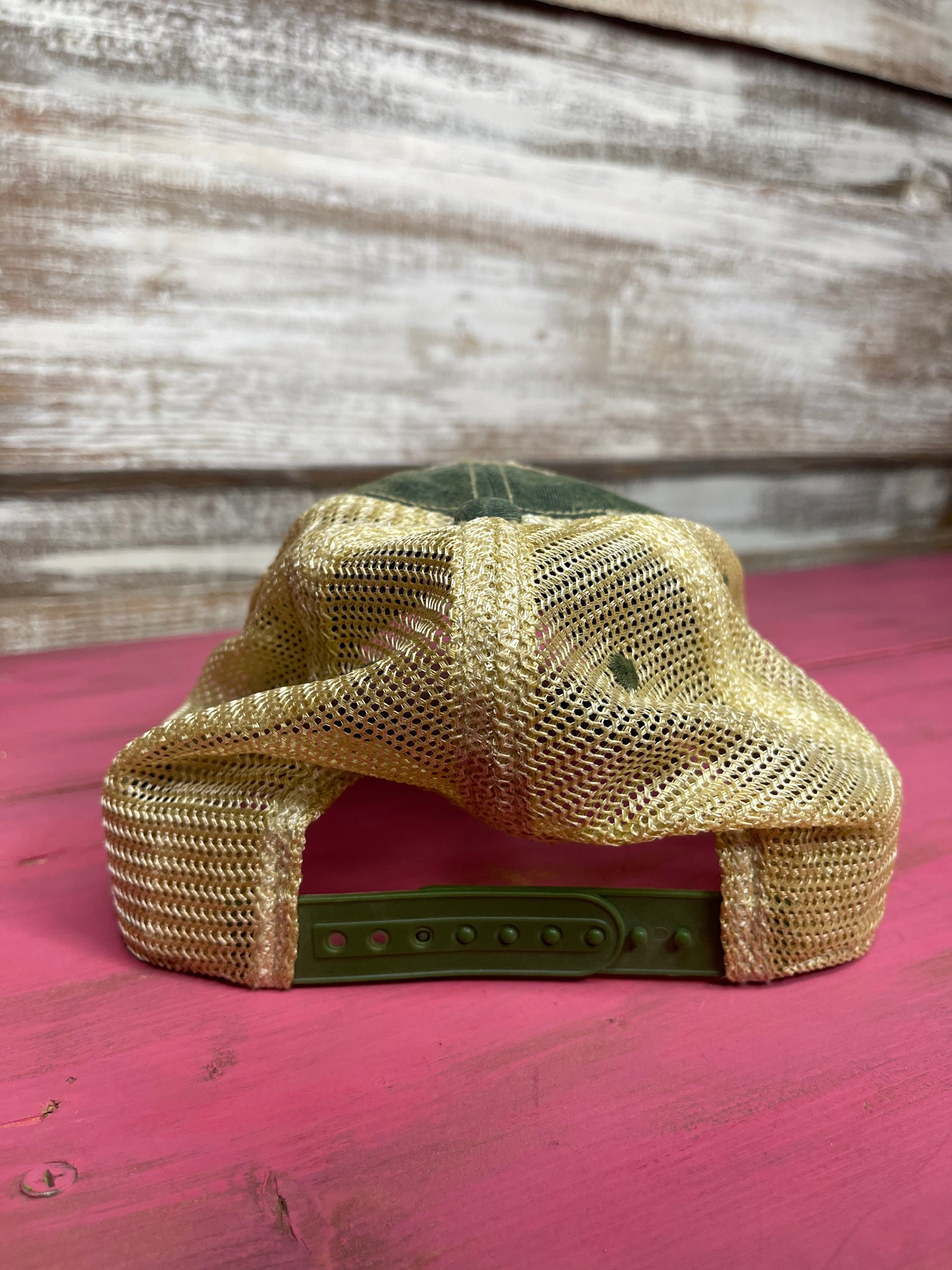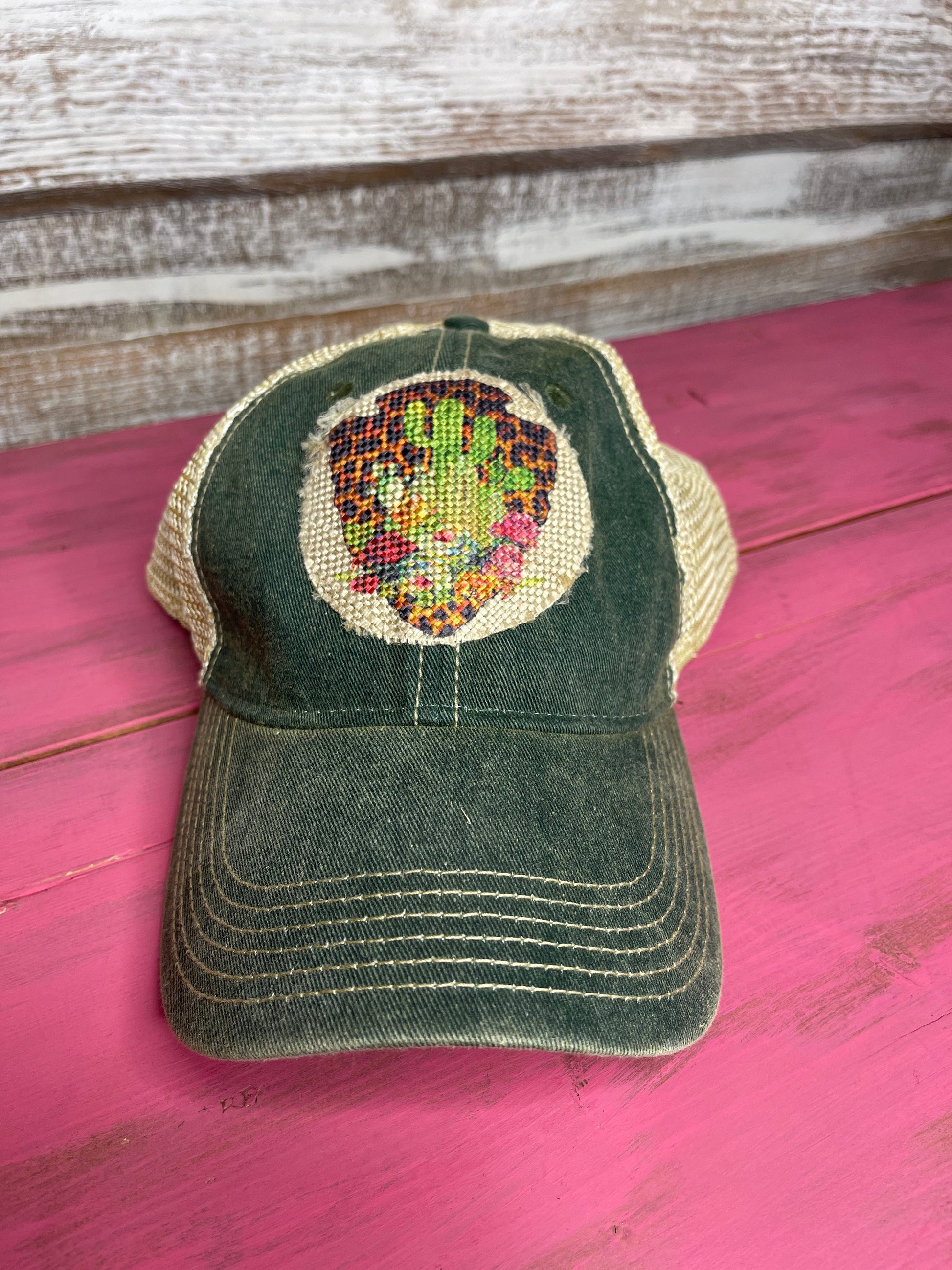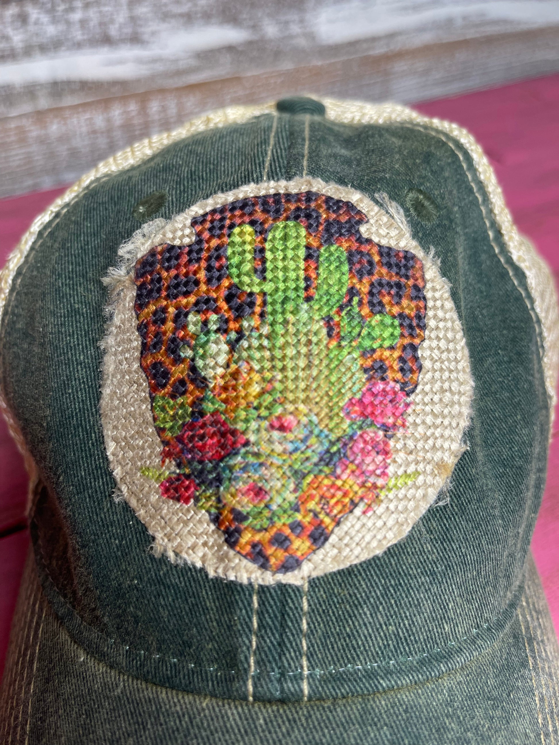 Trendy distressed hunter green cap with an Aztec leopard patch and a floral cactus design! The back of the cap is a tan mesh. Adjustable snap back closure.