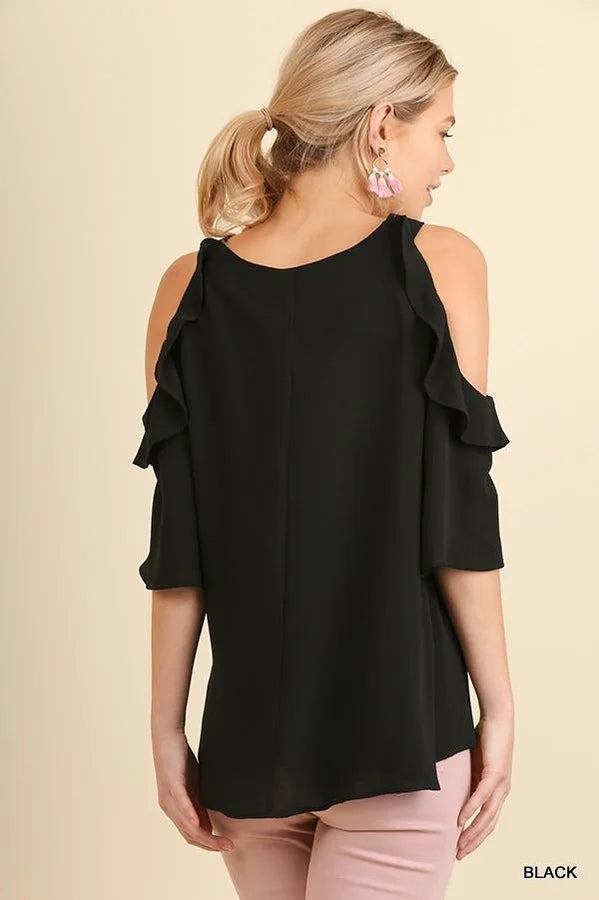 This black blouse is perfect for your wardrobe add your favorite jewelry to dress it up or down! Crafted with a cold shoulder design and ruffle details. The open shoulder design ensures a lightweight, breathable feel.