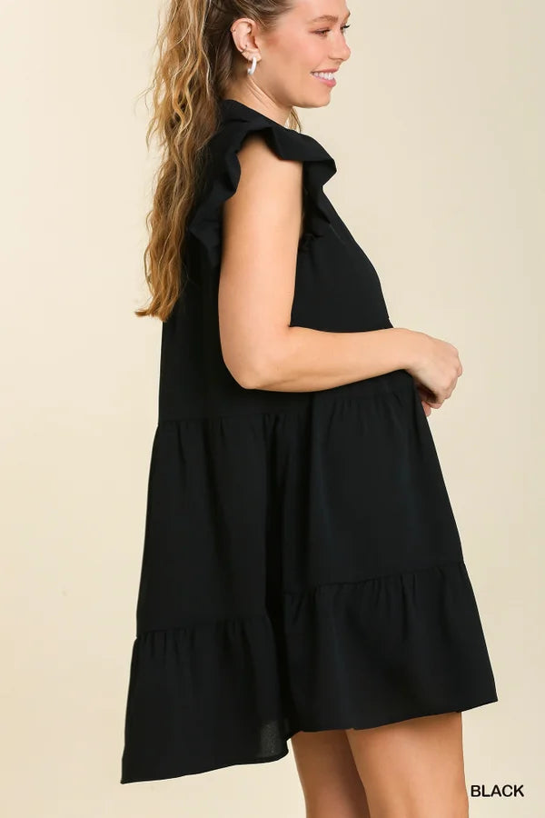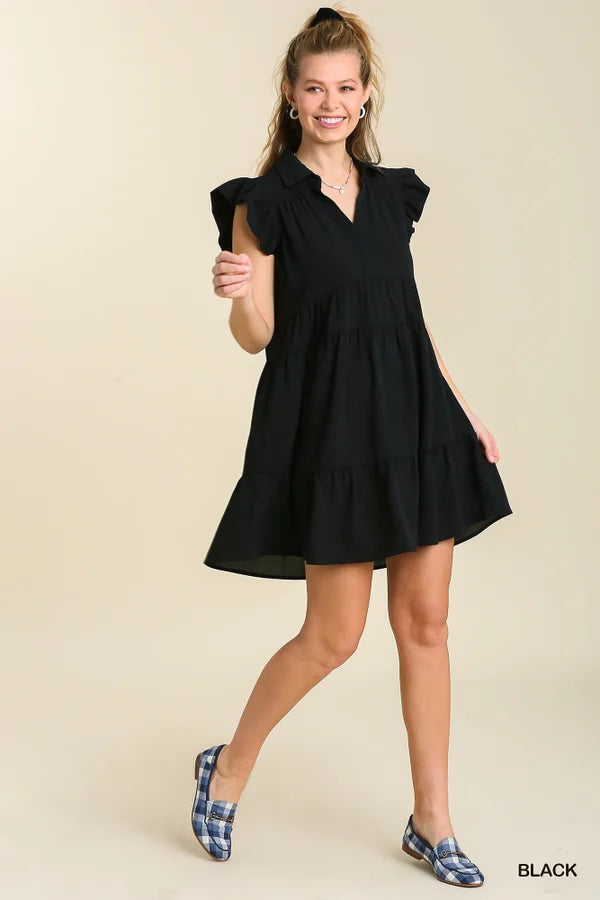 Trendy black tiered dress with flutter sleeves and a collar! Made by Umgee. We recommend ordering one size smaller than what you normally wear.
