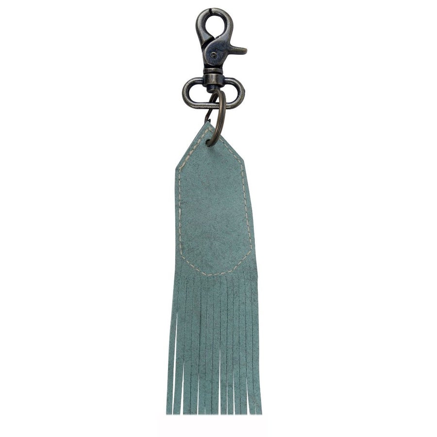Beautiful leather key chain with a pink floral tooled design and turquoise embossed leather fringe.