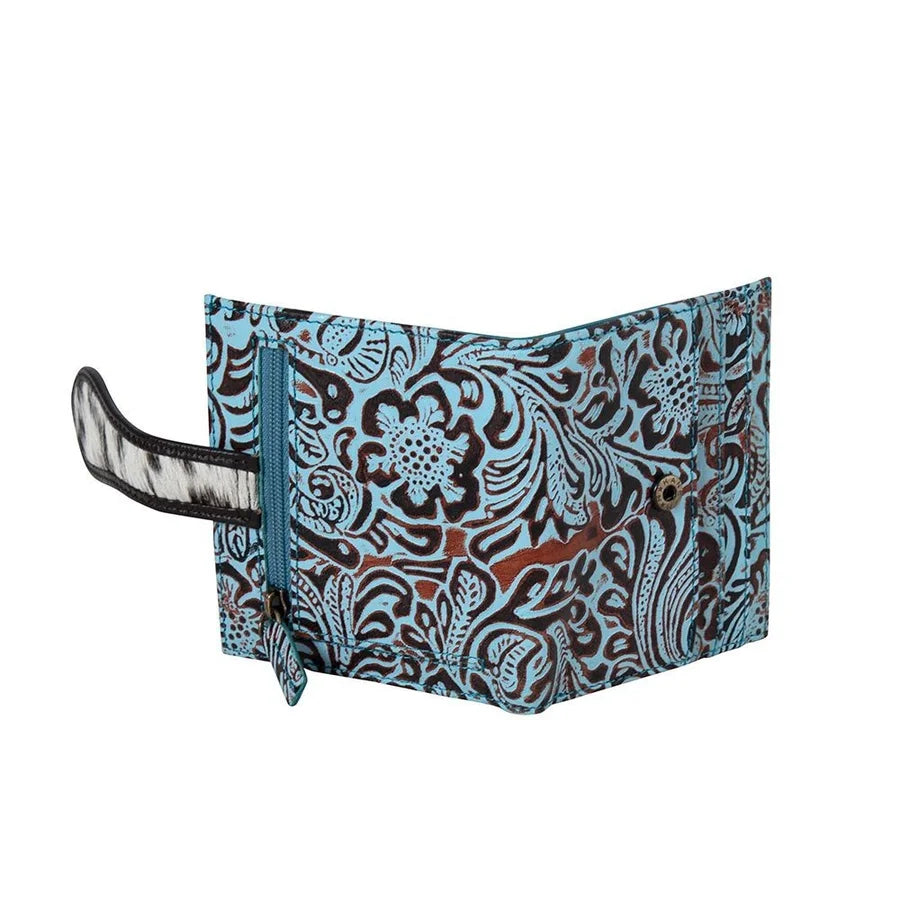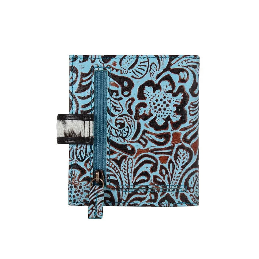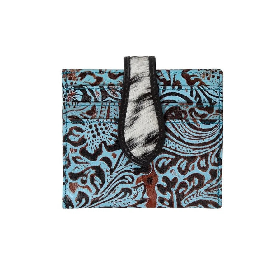 Beautiful turquoise and brown embossed leather cash/card holder with a cowhide snap closure! There are several card slots outside and inside to keep you organized as well as a zipper pocket on the backside. This cash/card holder is perfect to put in your pocket or small crossbody purse.