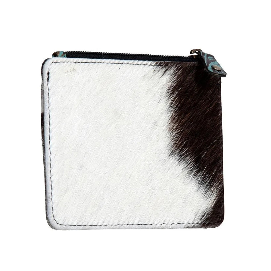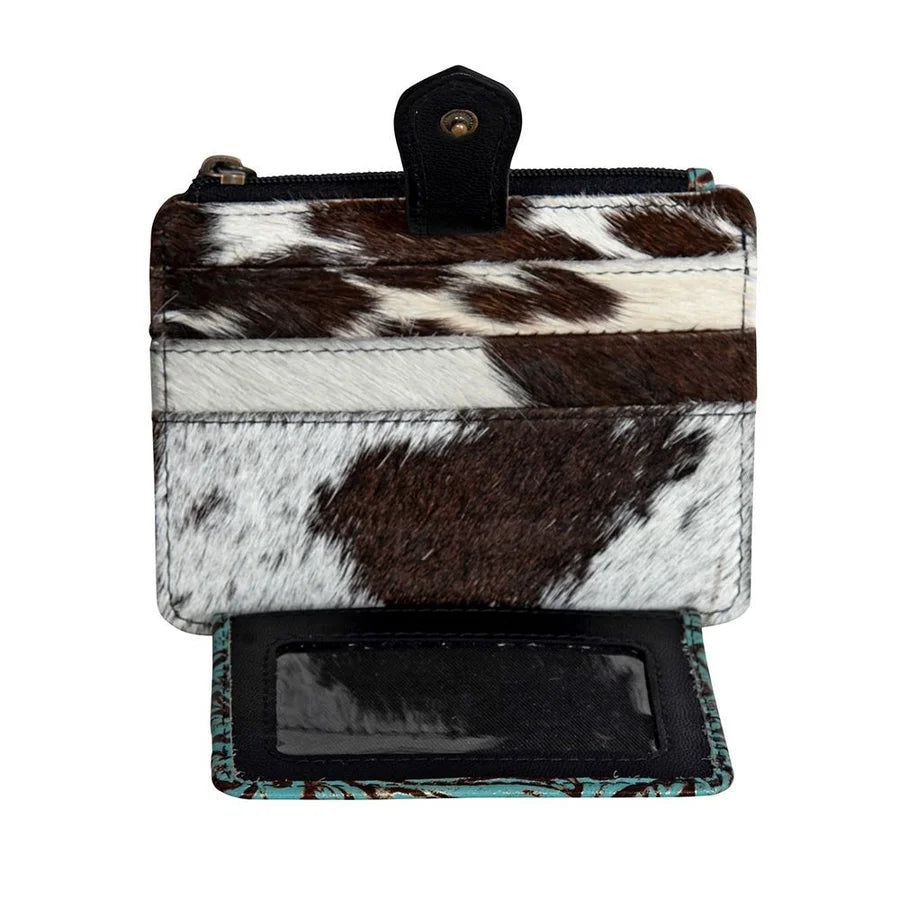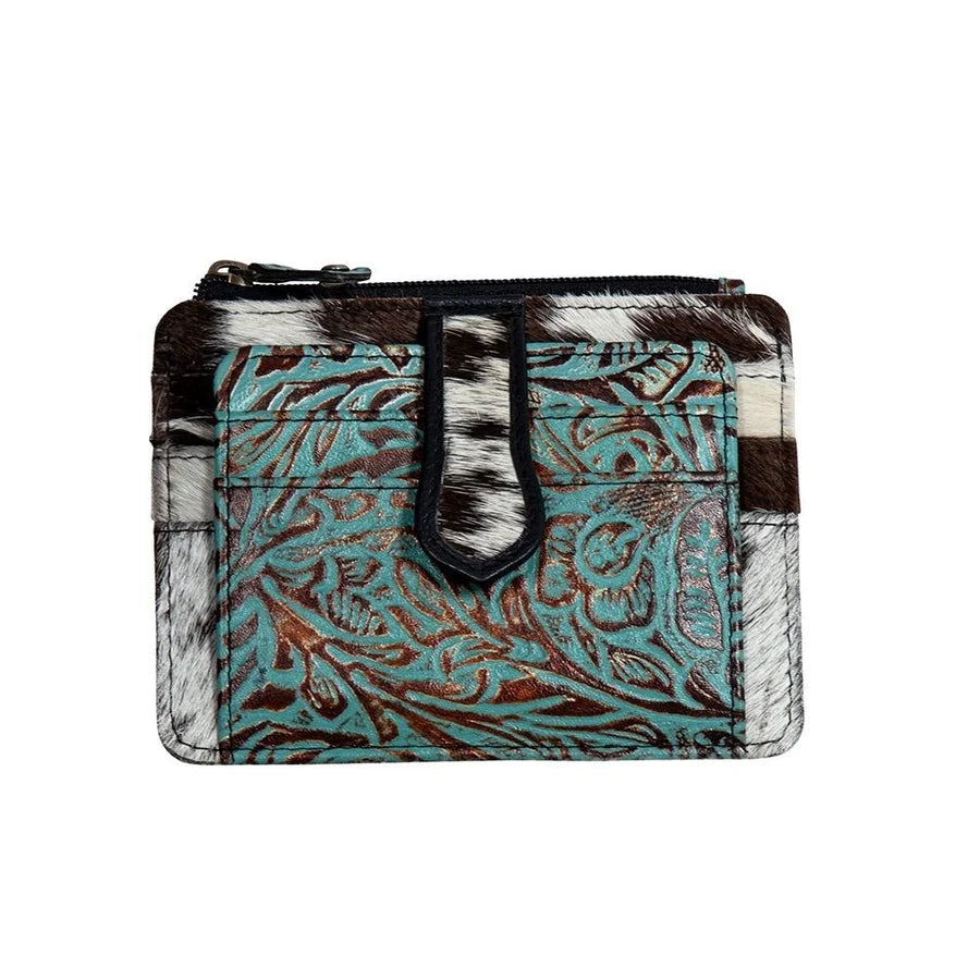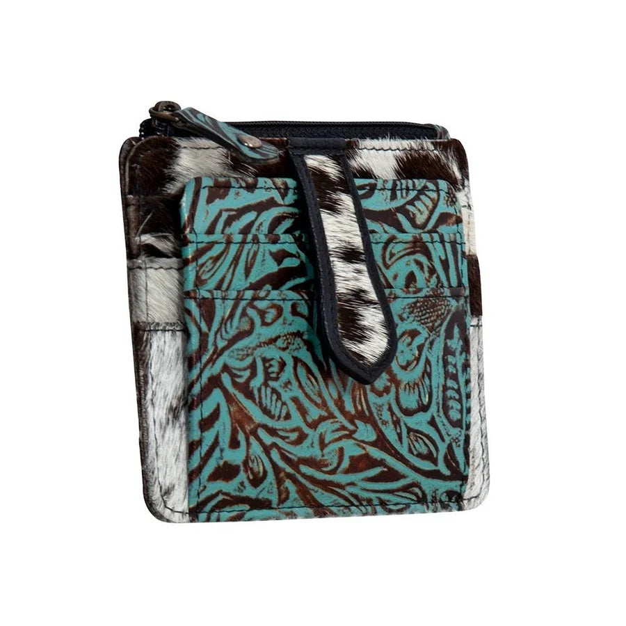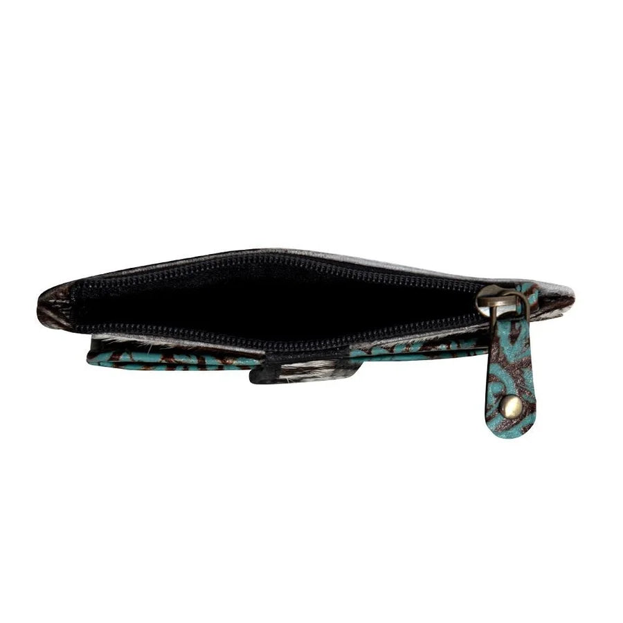 Beautiful brown and turquoise embossed leather with cowhide accents cash/card holder. Genuine leather and cowhide. This cash/card holder is the perfect size to put in your pocket or small purse. There are card slots on the inside as well as the outside and a cowhide magnetic snap closure. Keep you belongings secure with the zipper pocket.