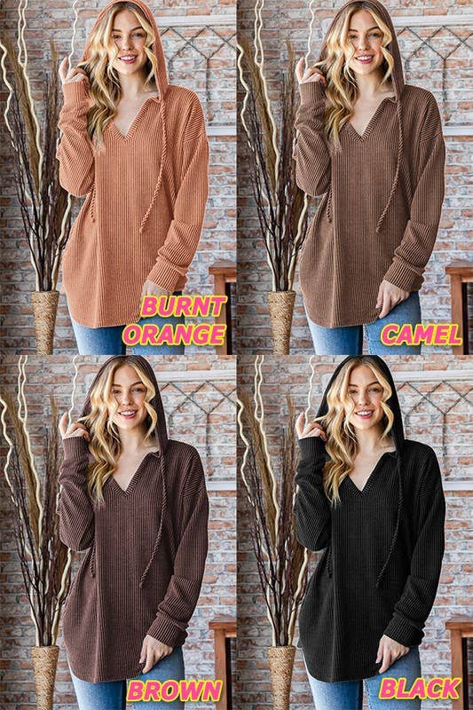 Soft ribbed black long sleeve v-neck draw string hoodie with round hem detail