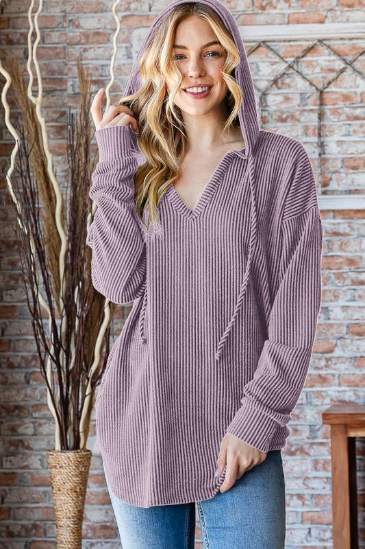 Soft ribbed dusty lavender long sleeve v-neck draw string hoodie with round hem detail