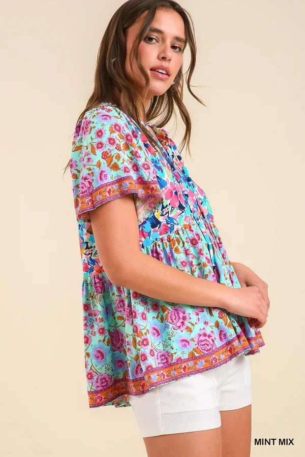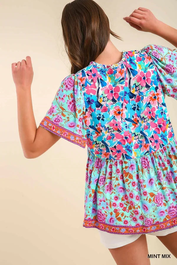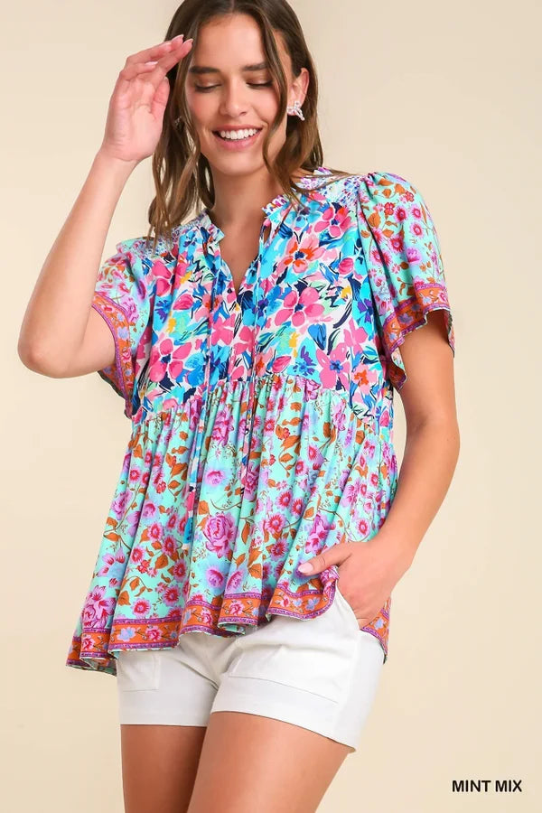 Fun floral mixed mint print top with a smocked shoulder and drawstring detail!