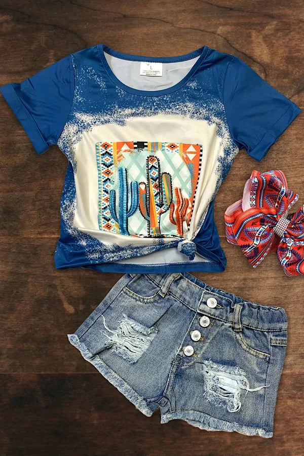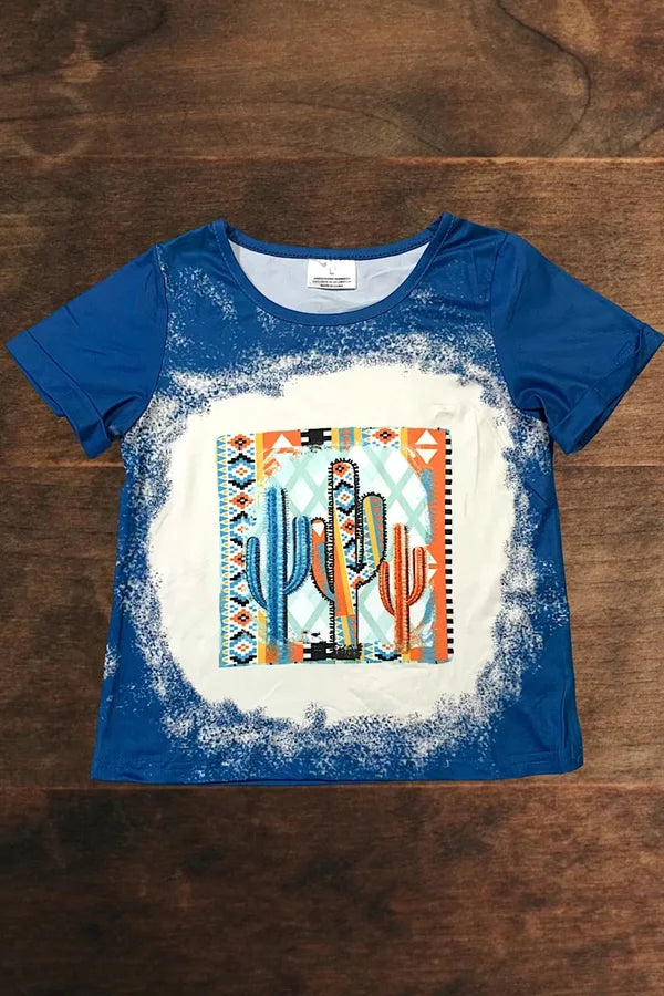 Trendy bleached look girls cactus Aztec blue graphic tee!