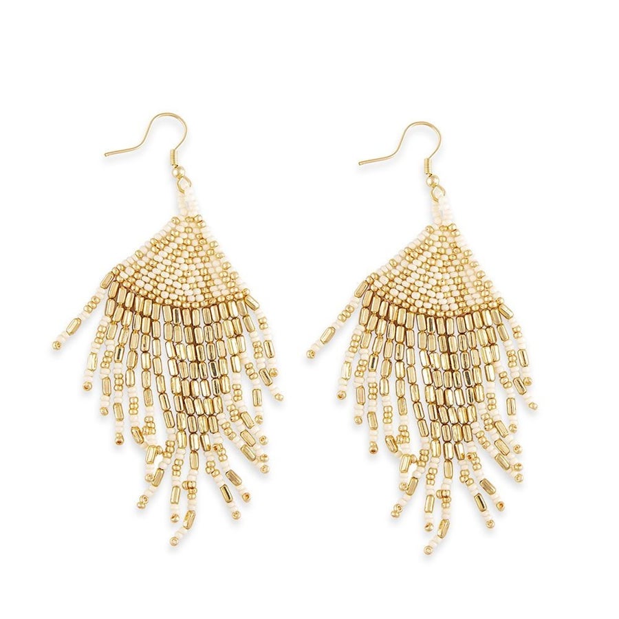 Beautiful gold and ivory cascading beaded earrings! These earrings make a fashion statement and are very light weight! They are versatile and can be styled boho, dressy or casual!