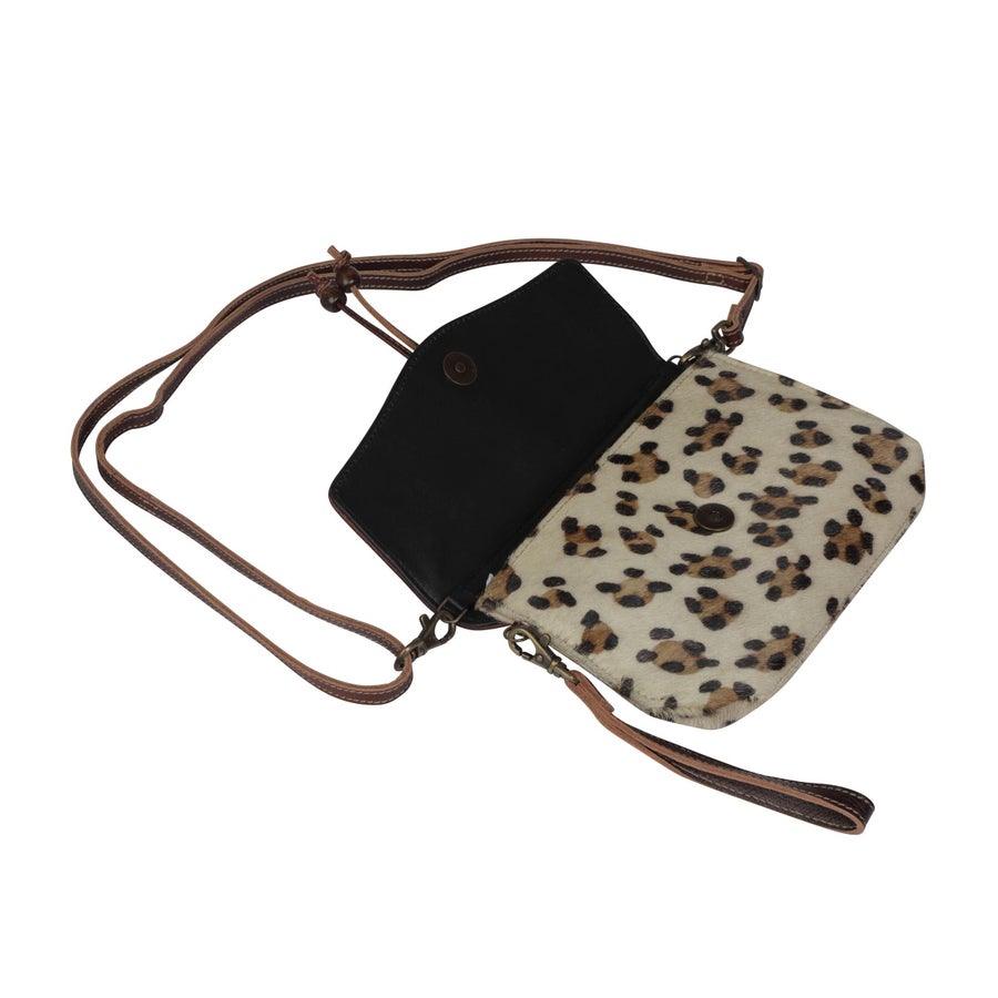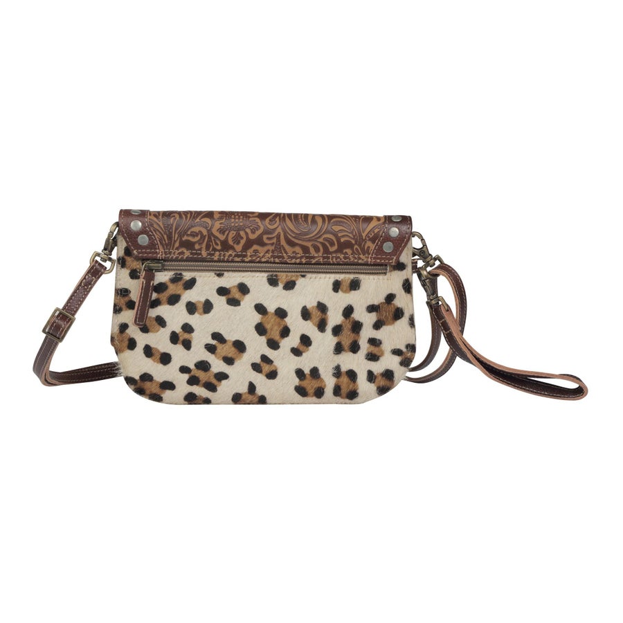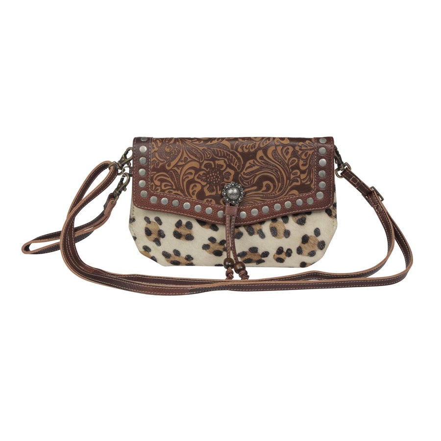 Get more for your money with this wallet that can be uses as a small crossbody or wristlet! Use it as your daily carry crossbody or take off the shoulder strap and use it as your wallet inside your larger purse. Big enough to carry all your cards, money, phone and other essentials without being heavy and weighing you down. Beautiful tooled brown leather and leopard print cowhide!
