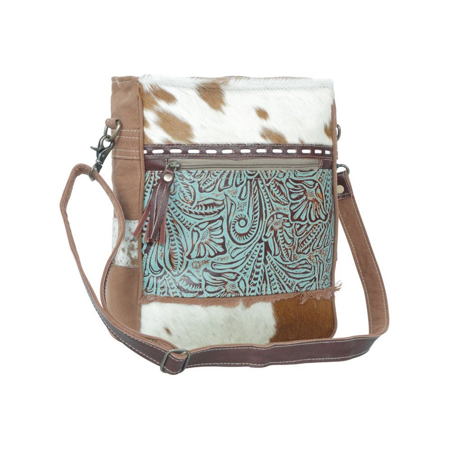 Beautiful embossed turquoise and brown leather with brown and white cowhide and white buck stitch trim! The sides and backside of this bag are a brown canvas material to help make the bag lighter.