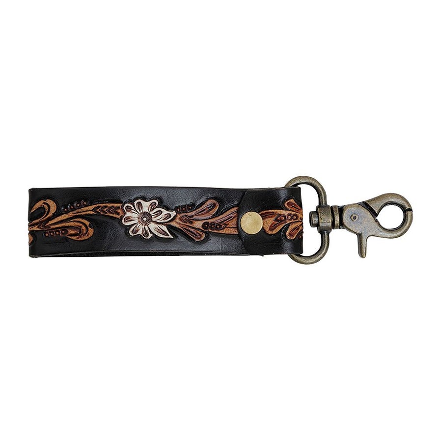 Classy brown and black leather key fob with tooled floral design and a metal clip. Made by Myra Bags.