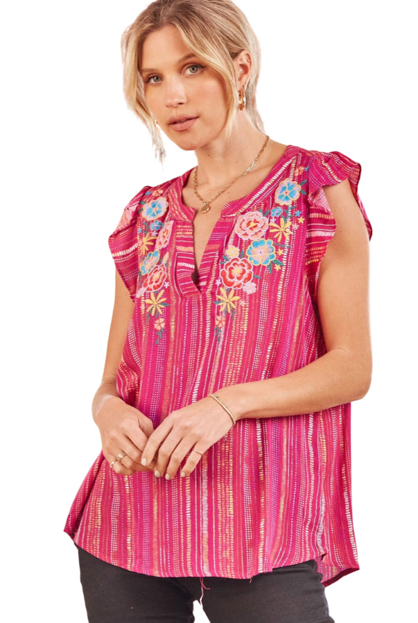 Beautiful Savanna Jane magenta top with floral embroidery all over the yoke and front side of the sleeves! Comfortable, flowy fit! Front tassel detail! Tassels can be worn tied or untied however you would like to style it! True to size.