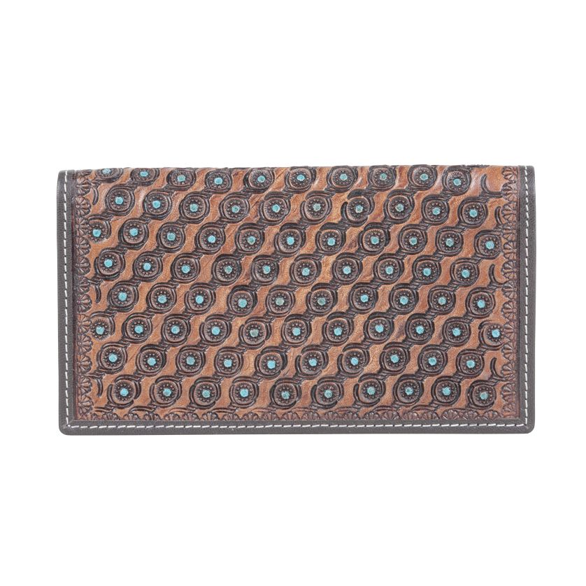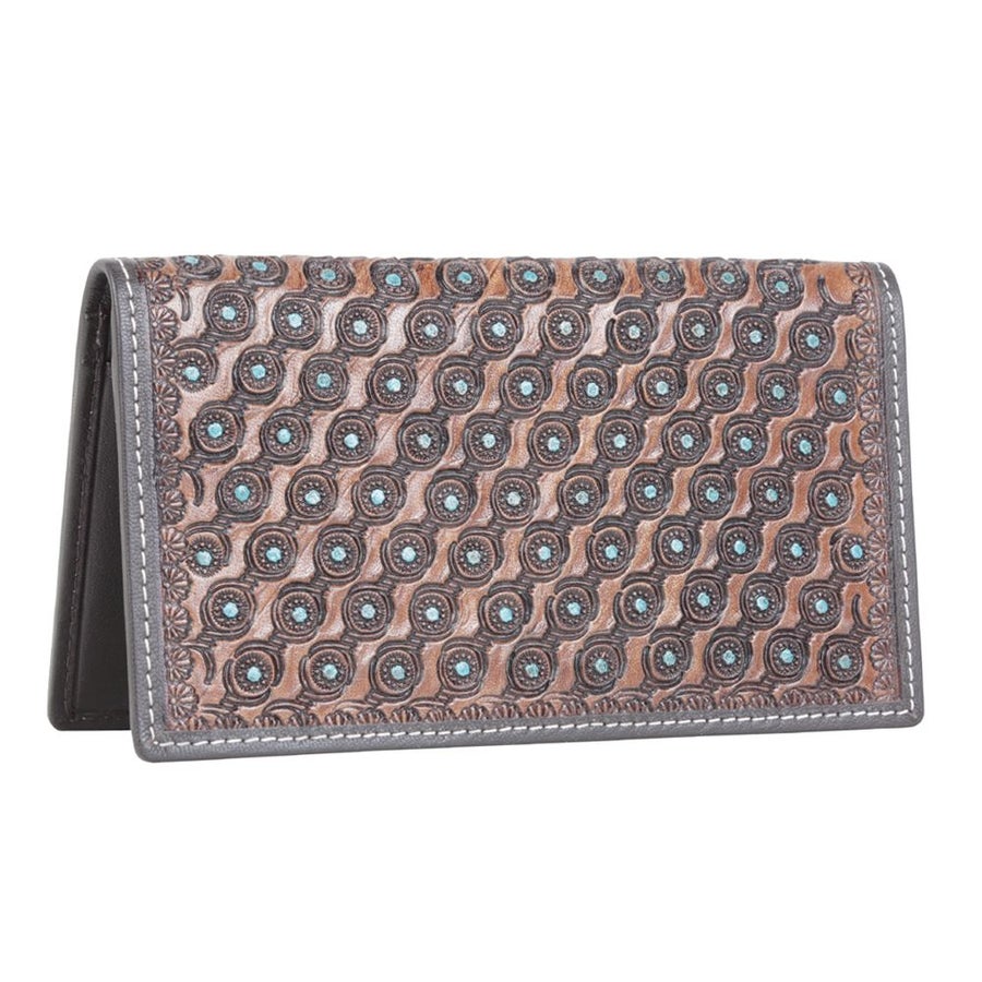 Classic brown leather wallet with a tooled design and turquoise accents! This wallet will match with so many different purses!