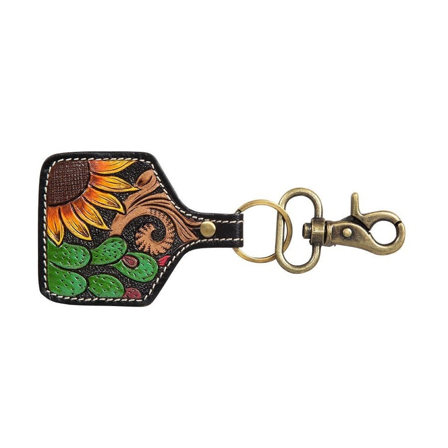 Fun and bright hand-tooled prairie sunflower and blooming prickly pear genuine ebony leather key fob.