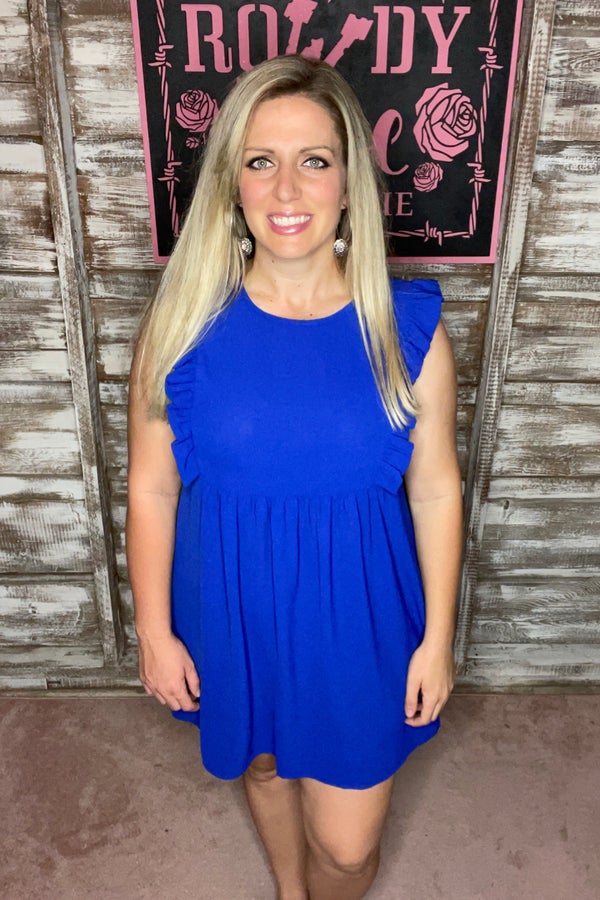 This royal blue solid U-neckline baby doll dress with ruffle cap sleeves is a great staple piece to add to your closet! Timeless and classy! This dress can easily be dressed up or down with jewelry and sandals or heels!