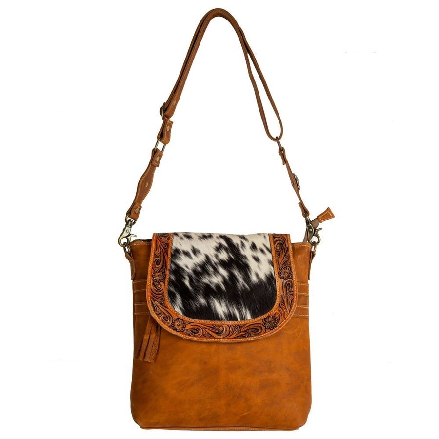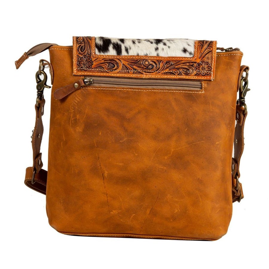 Gorgeous western genuine tooled warm caramel slightly distressed leather and cowhide bag made by Myra Bags! This bag features a magnetic cowhide flap outlined in tooled leather. There is a zipper pocket on the front and back side of the bag. The bag also zips closed. Inside is lined and features a zipper pocket and two open pockets. The shoulder strap is adjustable and removable. The color of the cowhide may vary slightly from what is pictured as all cowhides are unique.