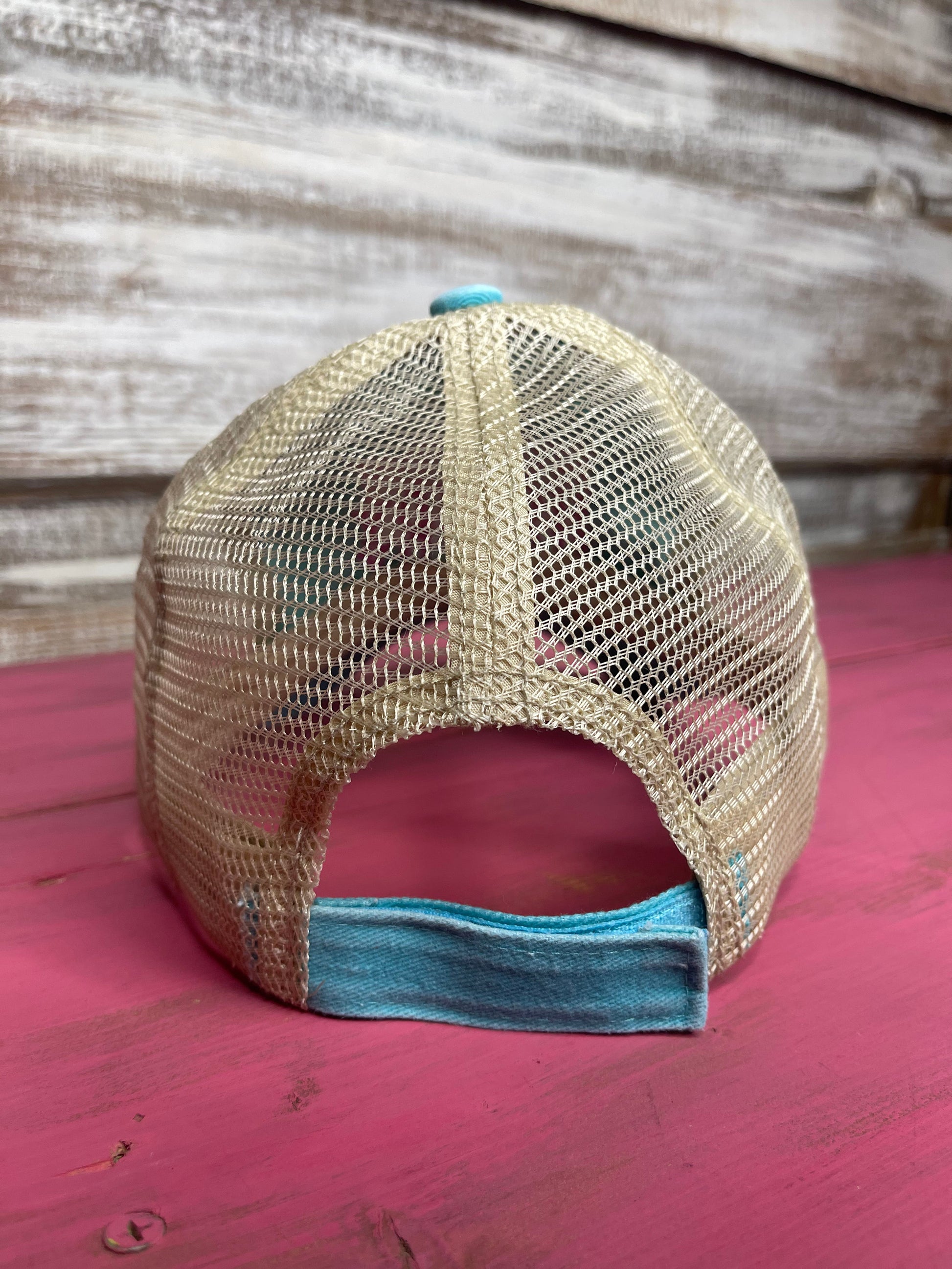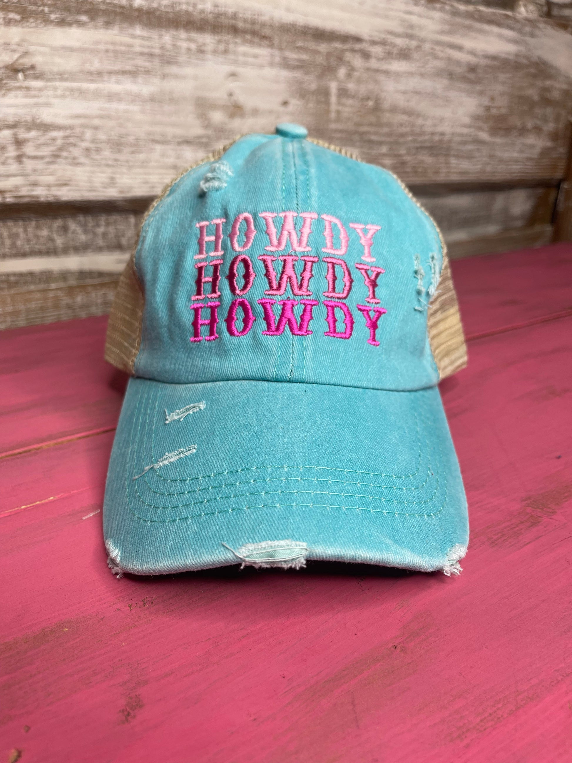 Turquoise cap with "Howdy Howdy Howdy" in shades of pink! Mesh back, adjustable closure.
