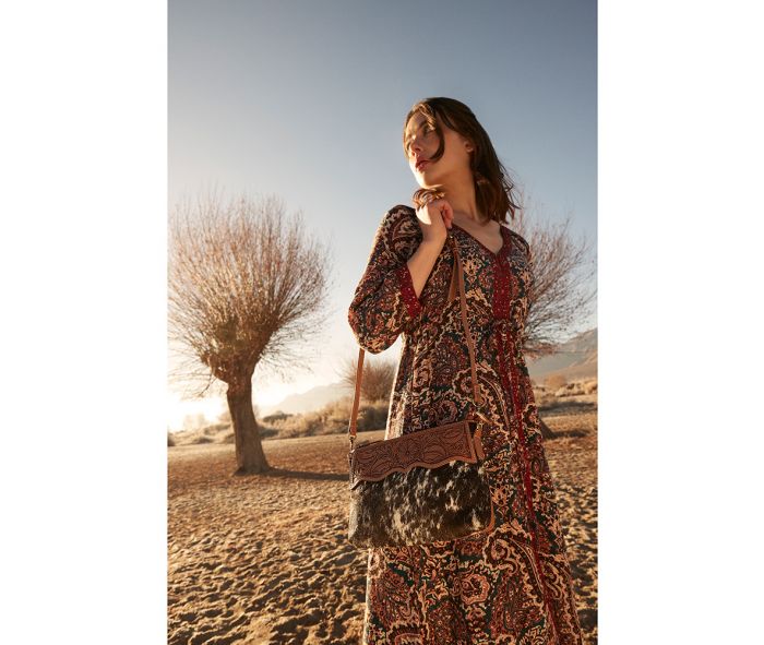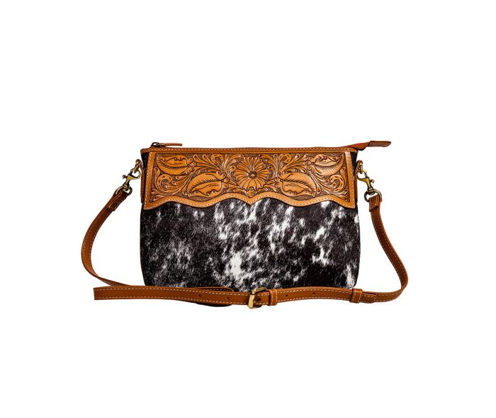 This knockout bag will express your great sense of style! The front features beautiful hand-tooled leather in timeless prairie blossom design, in the company of classic hair-on hide. The back is magnificent rich caramel leather, complete with zippered pocket. Features a full zipper-close top. The detachable, adjustable shoulder strap is in matching deep caramel leather. A gorgeous bag for any occasion!